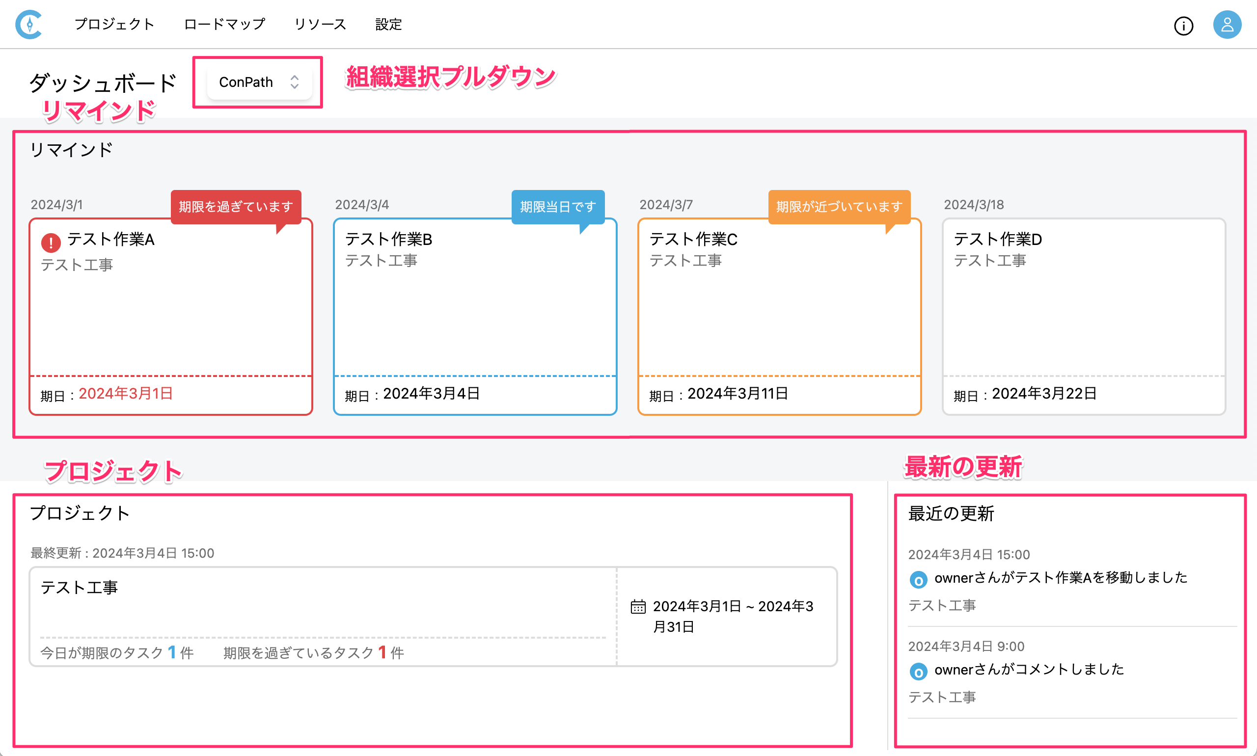 タスクの延期、コメントの追加などの最新の更新が表示され、クリックするとプロジェクト画面を新規タブで開き、該当のタスクやコメントまでスクロールします。