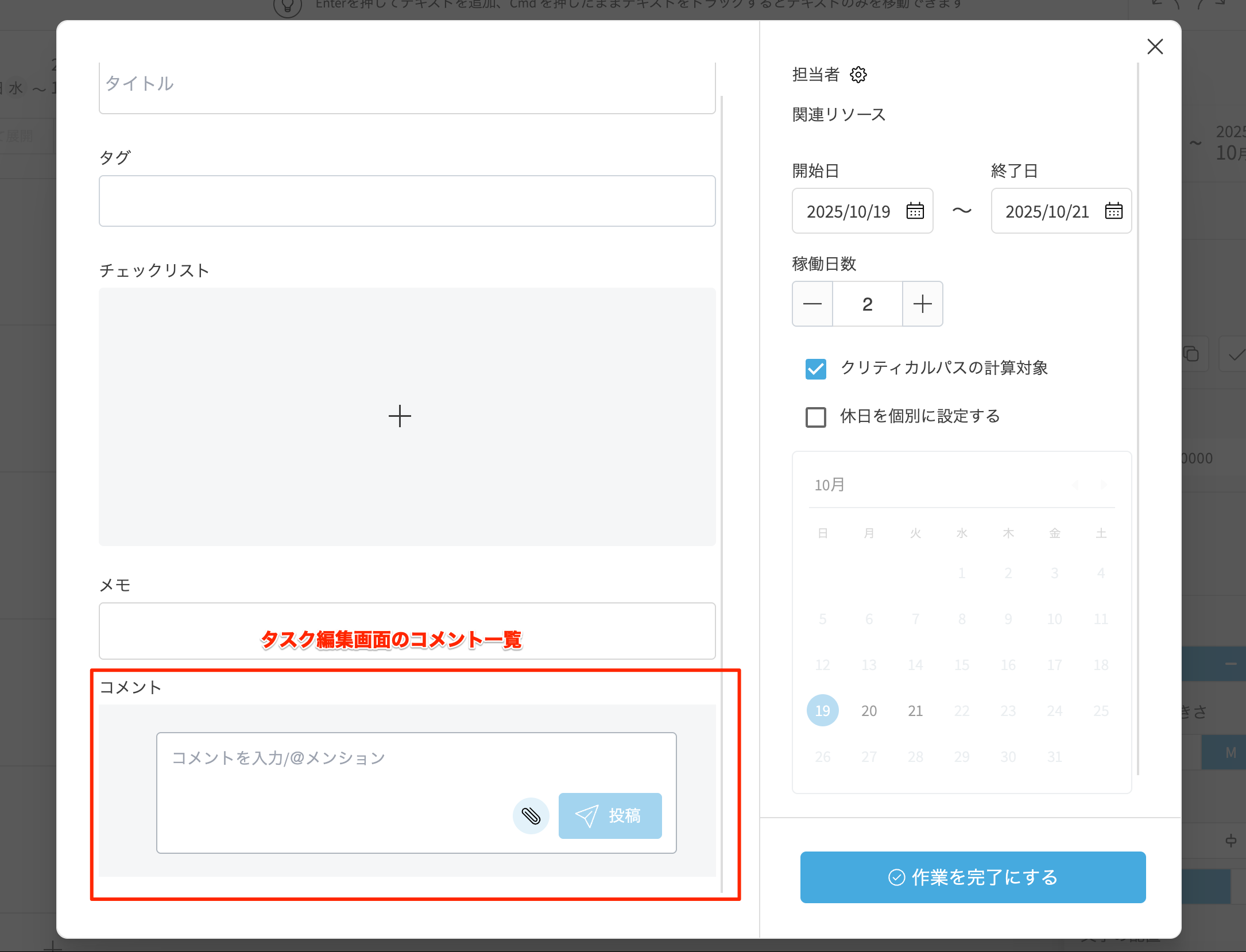 コメントのあるタスクが完了済みの場合、チェックマークにチェックが付きます。