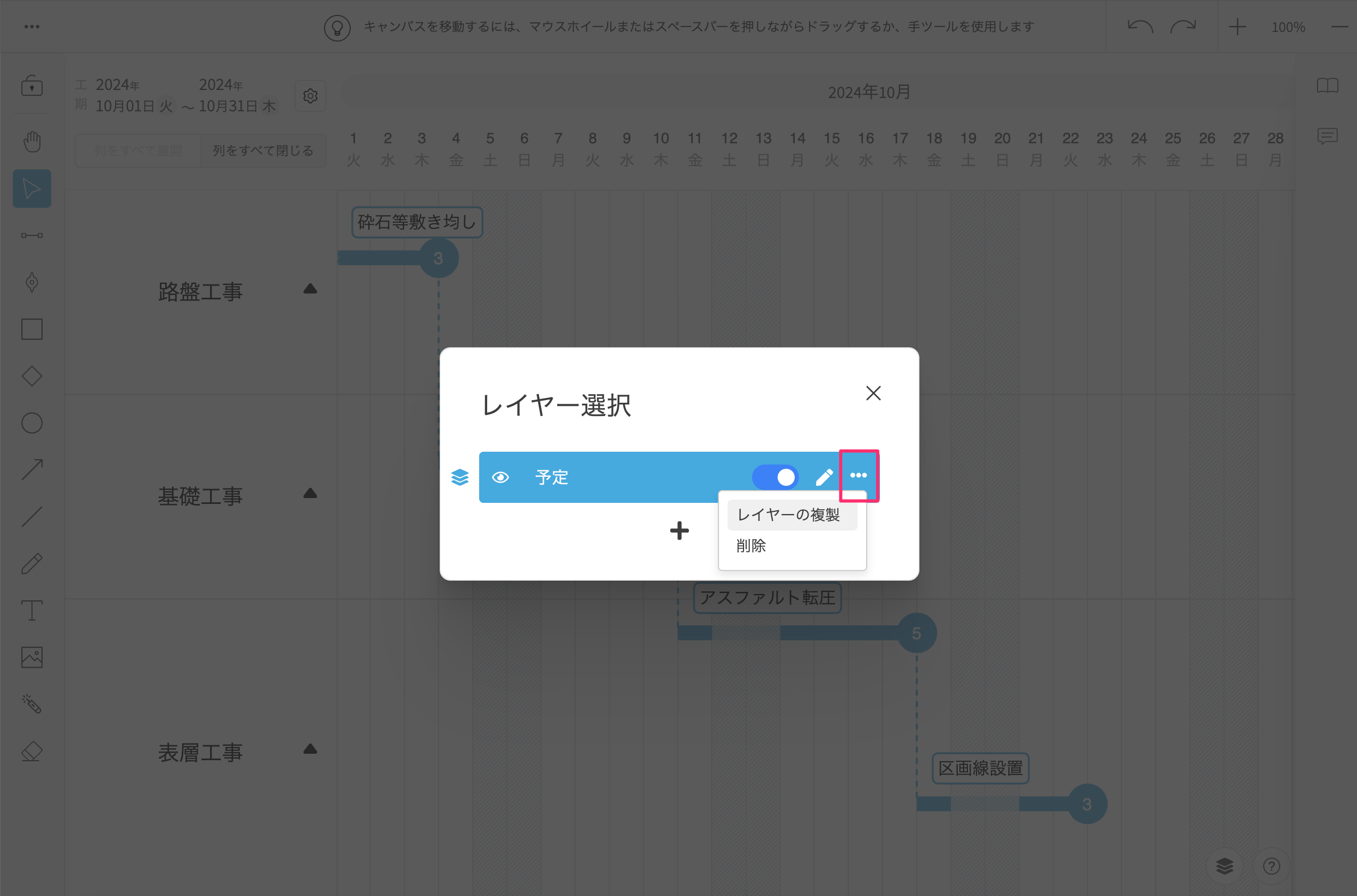 選択中のレイヤー、タスクやマイルストーンがあるレイヤーを削除することはできません。