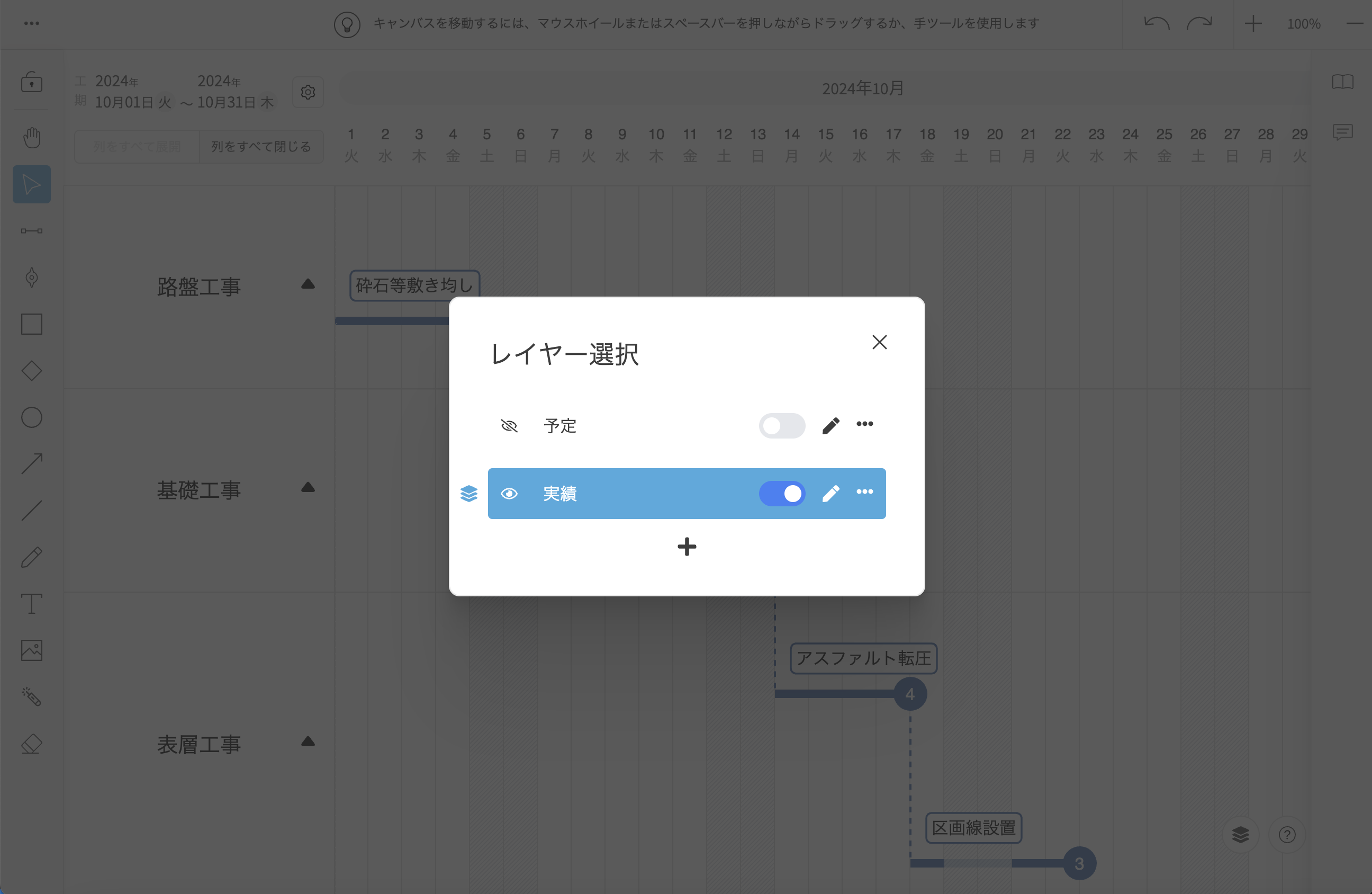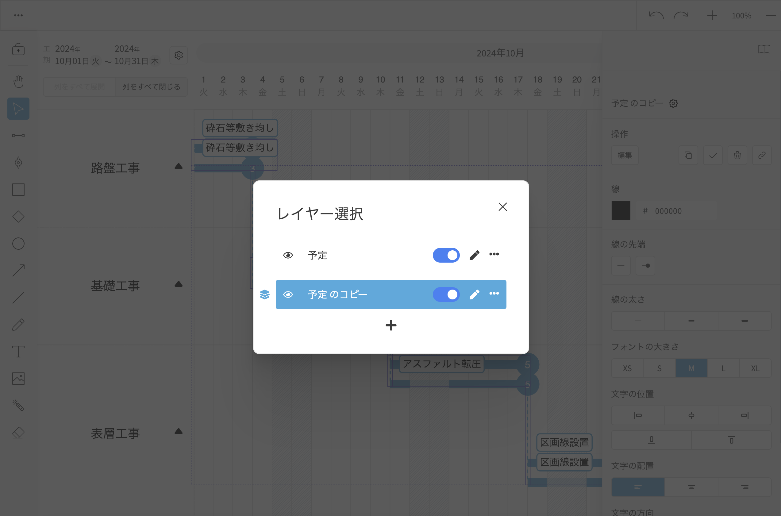 レイヤーを使用すると、他のレイヤーのコンテンツに影響を与えることなく、各レイヤーごとにタスクやマイルストーンの作成、編集、非表示などの操作を行うことができます。