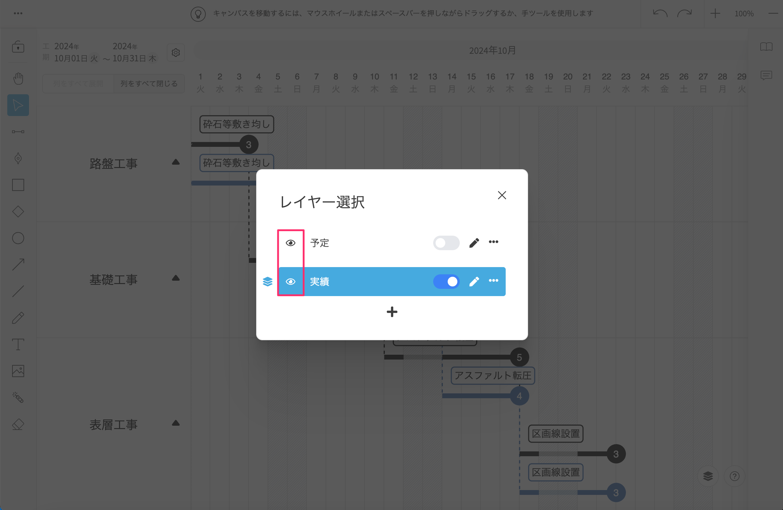 [目]アイコンの状態が変わり、レイヤーに属するタスク、マイルストーンの表示/非表示が変わります。