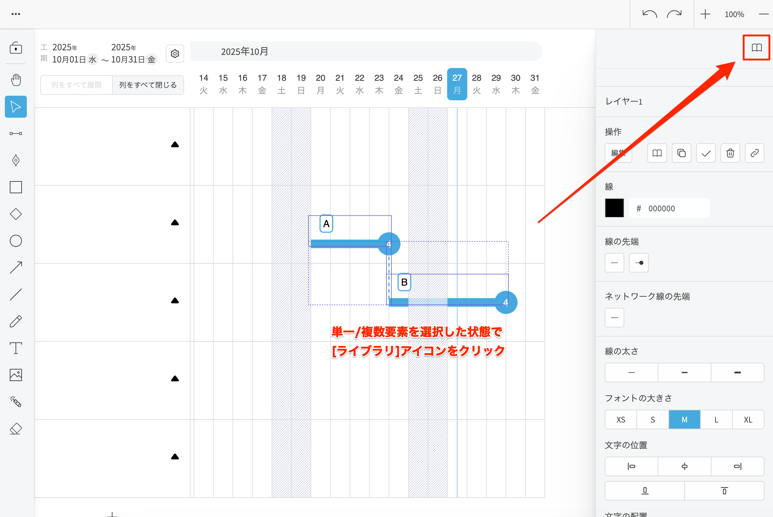 ライブラリに登録したい単一/複数要素を選択し、[ライブラリ]アイコンをクリックします。
