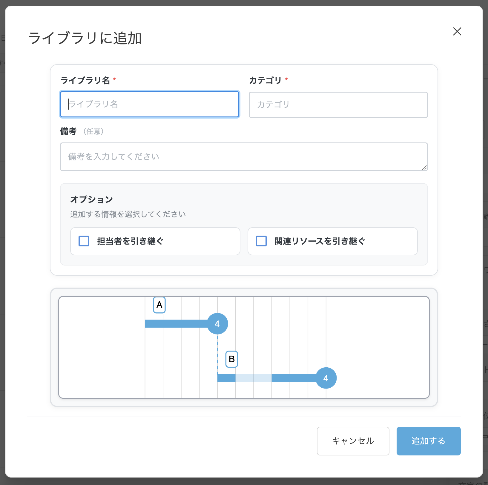 担当者を引き継ぐ、関連リソースを引き継ぐにチェックを入れると、担当者、関連リソースの情報もライブラリ呼び出し時に引き継ぐことができます。