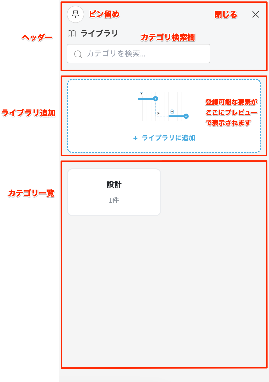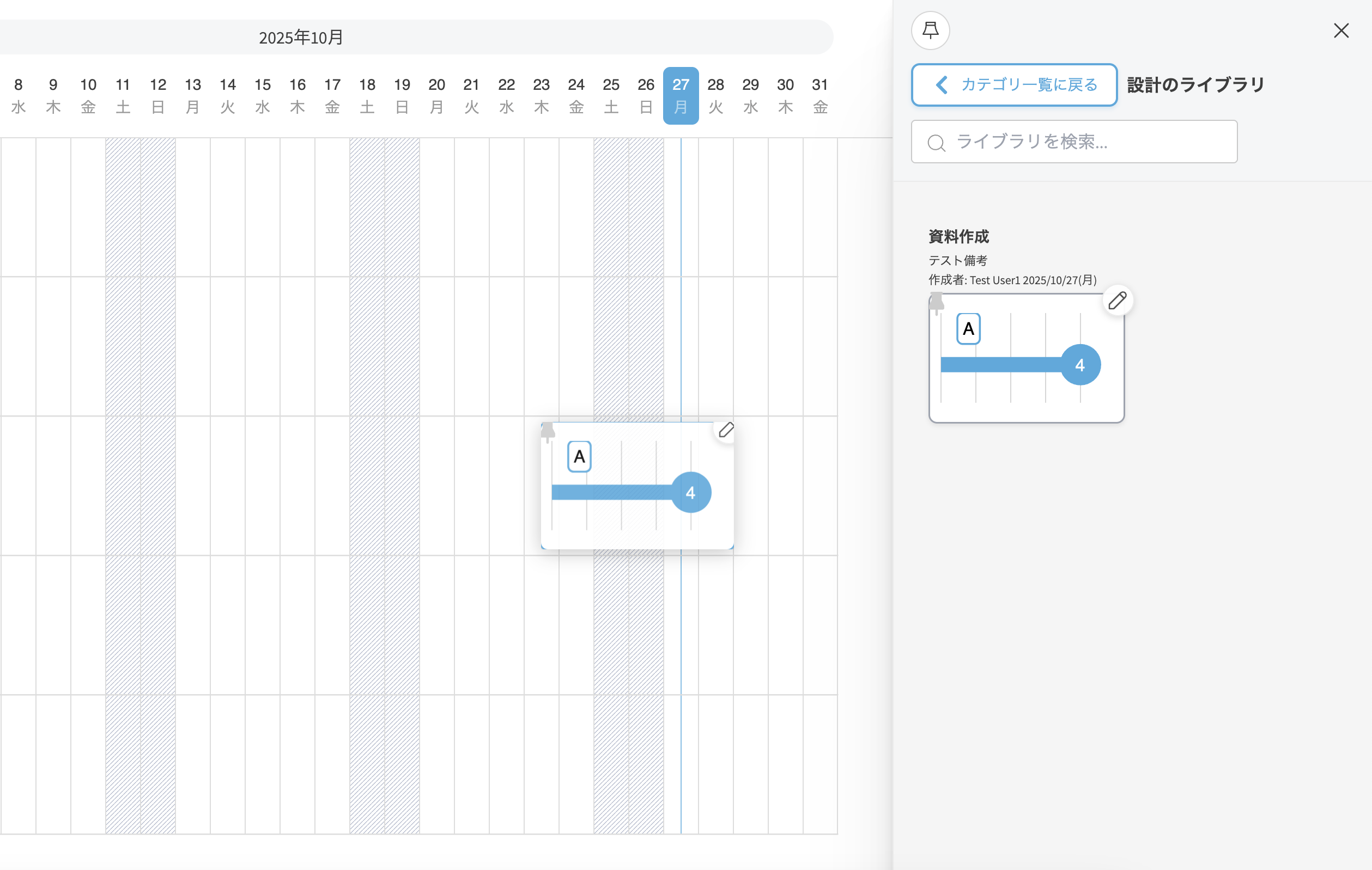 使用頻度の高いアイテムをライブラリに登録し、任意のタイミングでキャンバス上に貼り付けることができます。 ライブラリおよびライブラリのブックマーク状態は組織全体で共有されます。