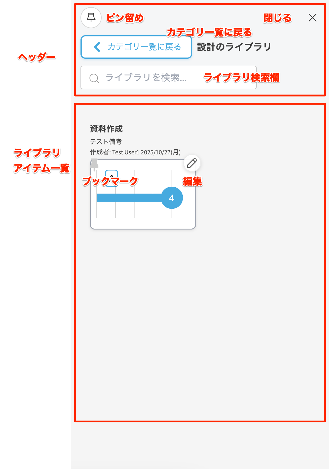 カテゴリ一覧の検索はカテゴリ名、アイテム一覧の検索はライブラリ名、作成者名、備考に対して行われます。部分一致で検索できます。