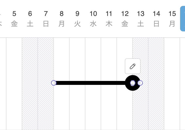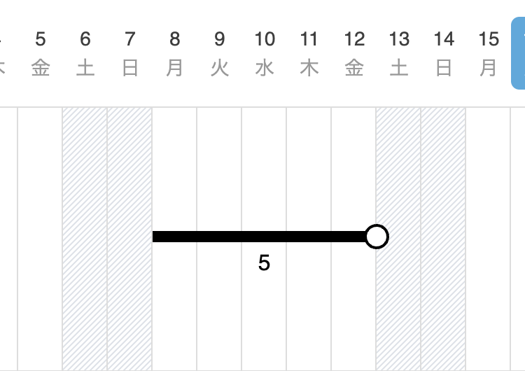 デフォルトは始点がなし、終点がドットとなります。 終点がドットまたはドット小の場合は点の中に期間が表示され、それ以外の場合はタスクの下側に期間が表示されます。