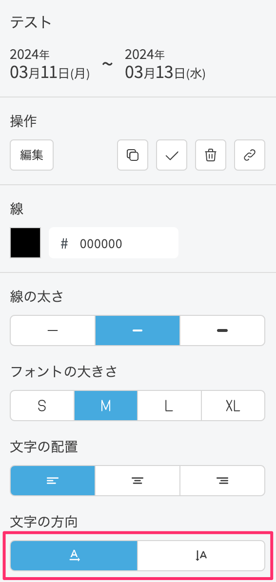 サイドバーの文字の方向から[横]または[縦]アイコンをクリックします。