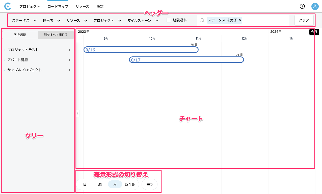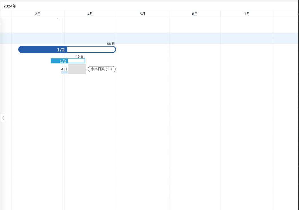 - ツリーのプロジェクト、またはタスクに対応したバーが上部のカレンダーの日付に合わせて表示されます。