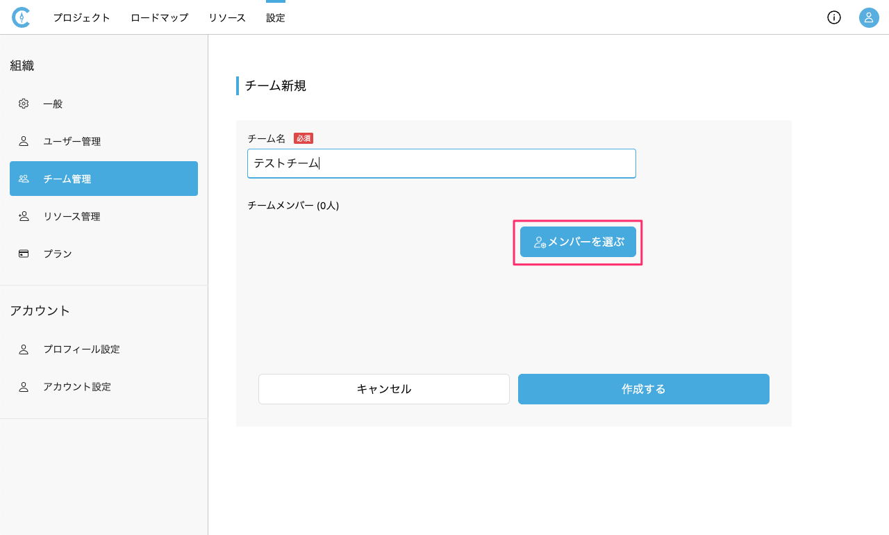 チーム名を入力し、[メンバーを選ぶ]ボタンをクリックします。