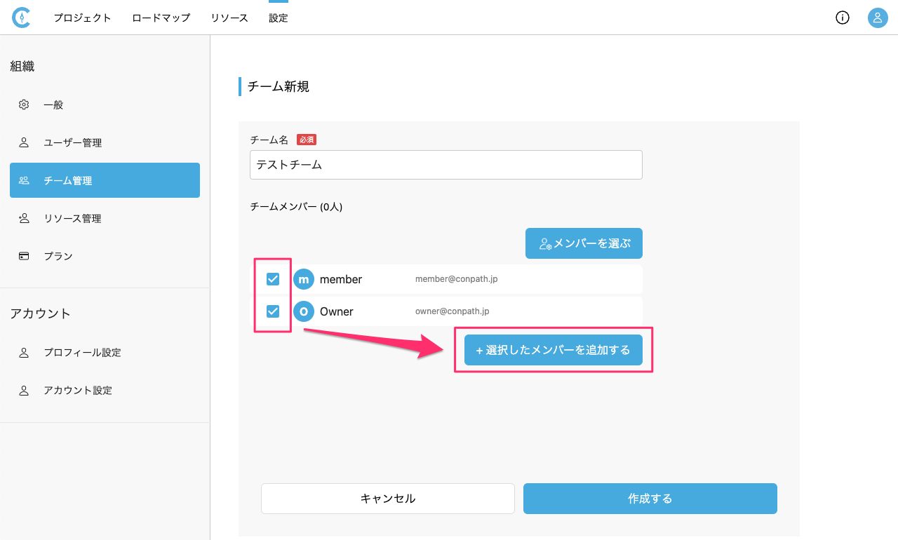 チームに追加するメンバーにチェックマークを付けて、[選択したメンバーを追加する]ボタンをクリックします。