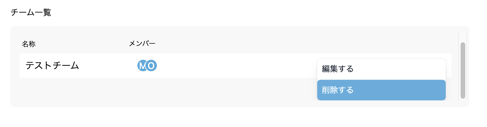 チーム一覧のチームの[…]のドロップダウンメニューから[削除する]をクリックします。
